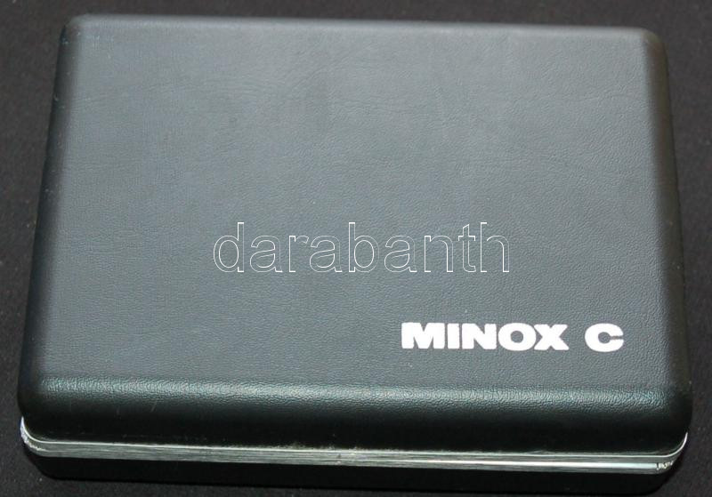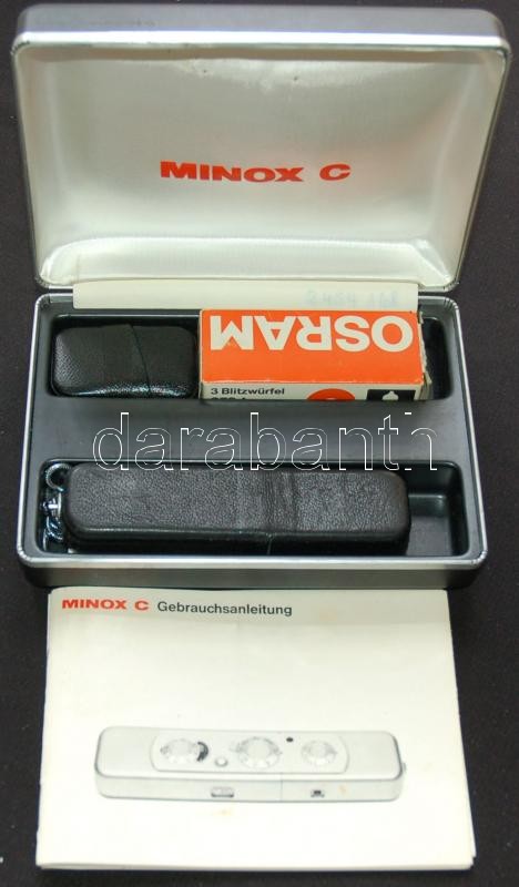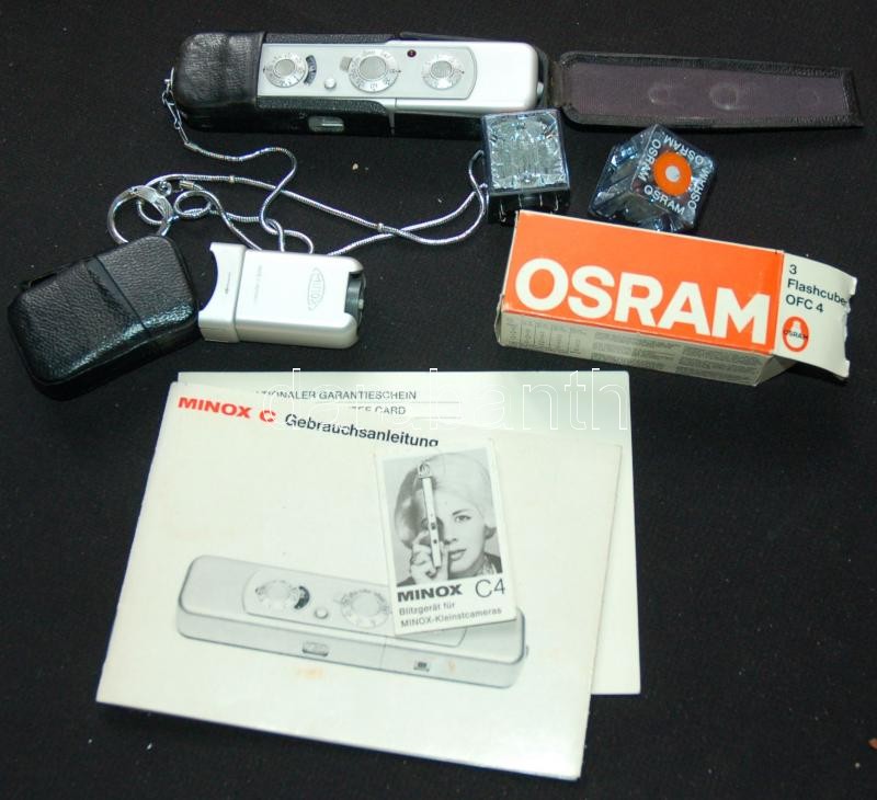 1975 Minox C típusú kém fényképezőgép eredeti dobozában, bőr tokkal, lánccal, hozzá tartozó C4-es vaku készülékkel, tartalék Osram lámpákkal, eredeti, német nyelvű leírással, hibátlan állapotban /
