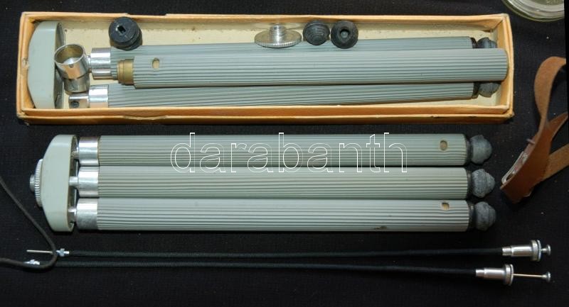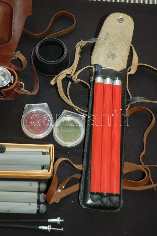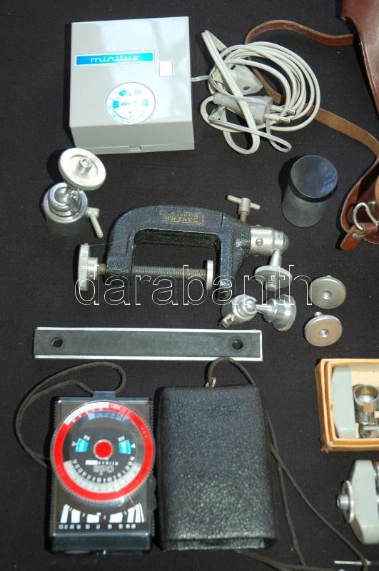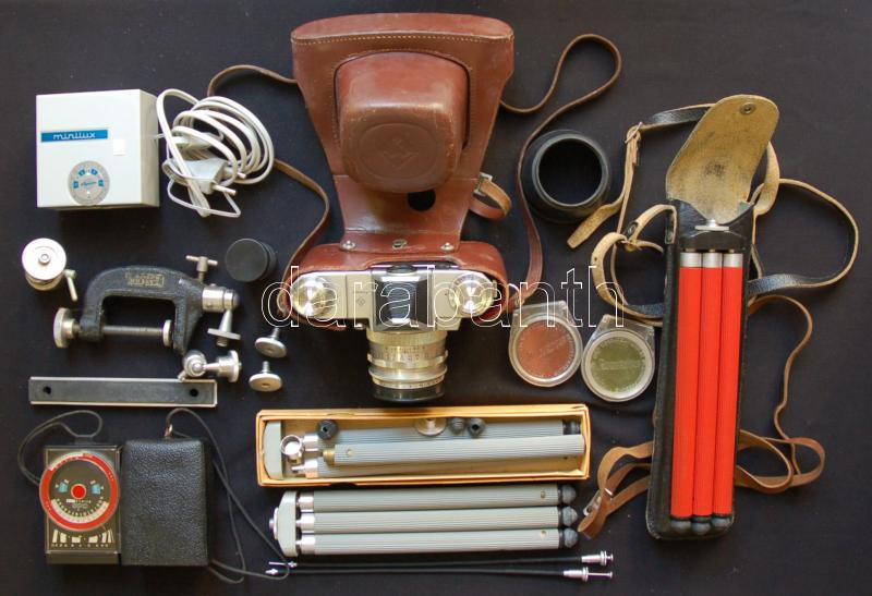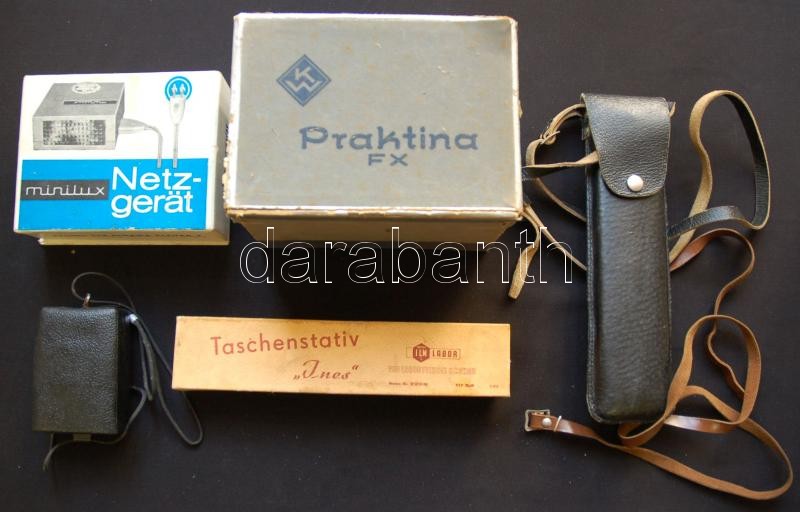 Praktina FX fényképezőgép és tartozékai komplett fotós tétel: Vaku, 2 db állvány, színszűrők, film. Mind szép állapotban