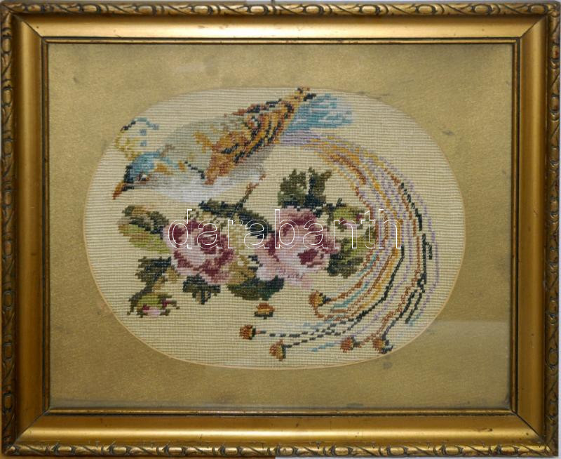 Beschreibung: cca. 1900 Pávát ábrázoló gobelin üvegezett keretben