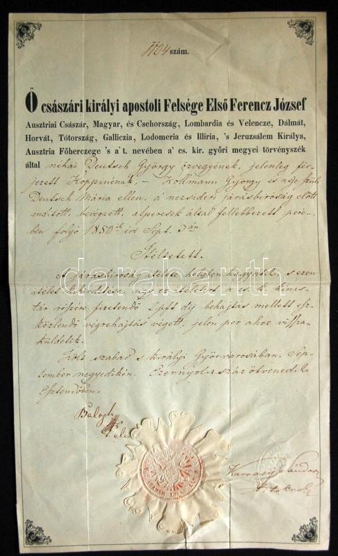 Beschreibung: 1850 Ítélet. Szép száraz pecséttel. Balogh Ferenc és Karvasy Sándor titoknok aláírásaival 25x31 cm