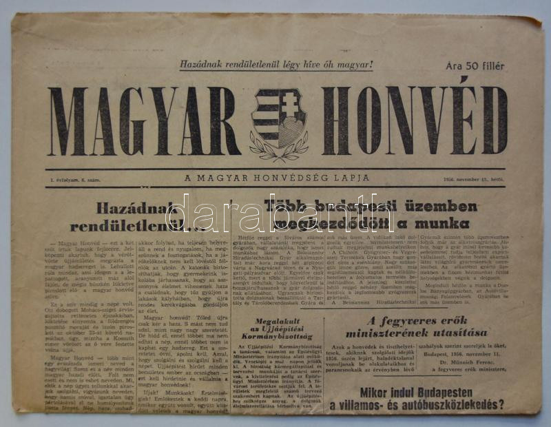 1956. november 12. I. évf. 6.szám Magyar Honvéd. A Magyar Honvédség la... https://www.darabanth.com/de/158-Fernauktion/158.0/Andere-Sammelgebiete/Historische-Dokumenten-Handschriften~177/1956-november-12-I-evf-6szam-Magyar-Honved-A-Magyar-Honvedseg-lapja-Benne-a-forradalom-h~II498377