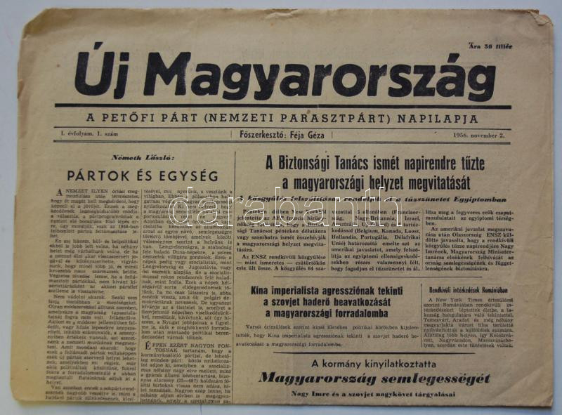 1956. november 2. I. évf. 1.szám Új Magyarország. A Petőfi Párt (Nemze... https://www.darabanth.com/de/158-Fernauktion/158.0/Andere-Sammelgebiete/Historische-Dokumenten-Handschriften~177/1956-november-2-I-evf-1szam-Uj-Magyarorszag-A-Petofi-Part-Nemzeti-Parasztpart-Napilap~II498382