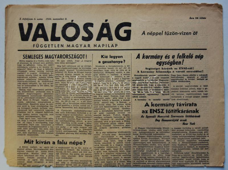 1956. november 2. Valóság. Független Magyar Napilap I. évf. 3.szám . B... https://www.darabanth.com/de/158-Fernauktion/158.0/Andere-Sammelgebiete/Historische-Dokumenten-Handschriften~177/1956-november-2-Valosag-Fuggetlen-Magyar-Napilap-I-evf-3szam-Benne-a-forradalom-hireiv~II498407