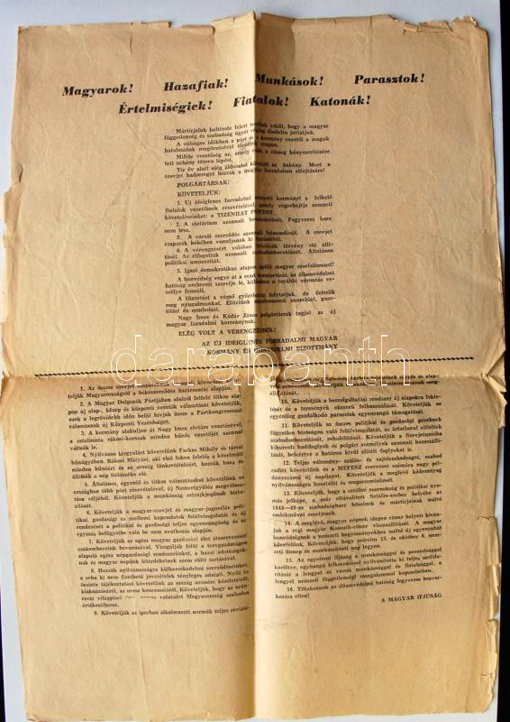 1956 október 29. Magyar Ifjúság plakátja: Magyarok!Hazafiak! Munkások... https://www.darabanth.com/de/158-Fernauktion/158.0/Andere-Sammelgebiete/Historische-Dokumenten-Handschriften~177/1956-oktober-29-Magyar-Ifjusag-plakatja-MagyarokHazafiak-Munkasok-Parasztok-Ertelmiseg~II498289