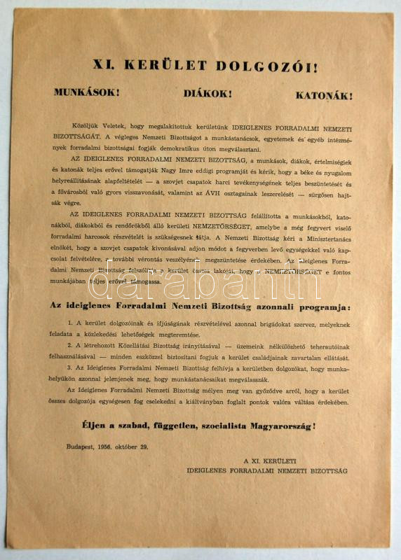 1956 október 29. plakát: XI. kerület Dogozói! Munkások! Diákok! Katonák! Az Ideiglenes Forradalmi Nemzeti Bizottság megalakításáról, és programjáról 41,5x60cm