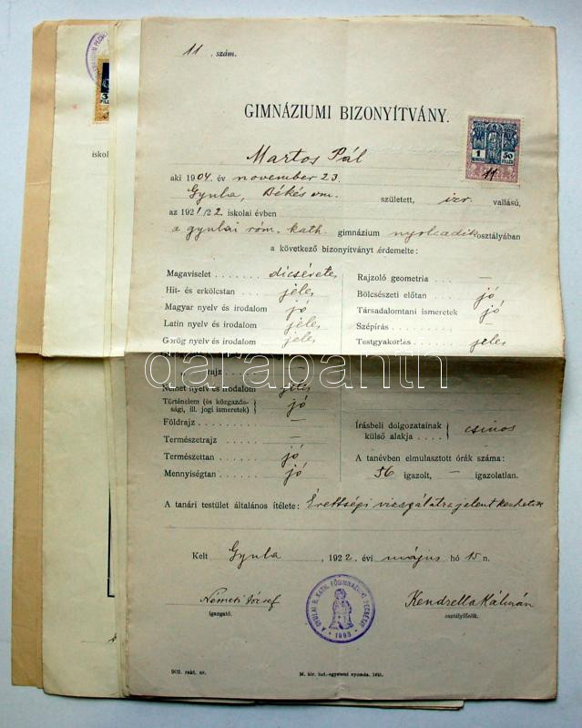 1914/15-1921/22 Egy izraelita személy teljes sorozatú bizonyítványa ... https://www.darabanth.com/de/158-Fernauktion/158.0/Andere-Sammelgebiete/Judaica~180/191415-192122-Egy-izraelita-szemely-teljes-sorozatu-bizonyitvanya-Gyulai-Gorog-Katolikus-~II500313