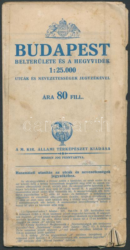 Háború előtti Budapest térkép 1:25.000, Magyar Királyi Állami Térképészet kiadása kihajtható, színes, külön intézmények gyűjteményével, utca regiszterrel, kissé megviselt állapotban