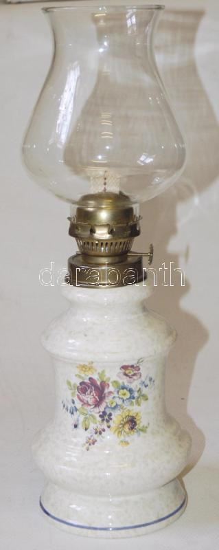 Beschreibung: Festett porcelán petróleum lámpa üveg búrával apró lepattogzásokkal és repedéssel/