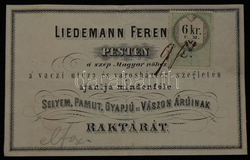Beschreibung: 1850 LIedemann Ferenc selyen és szövetárus Pest reklámcédula számlaként felhasználva 6kr CM okmánybélyeggel 13x8 cm