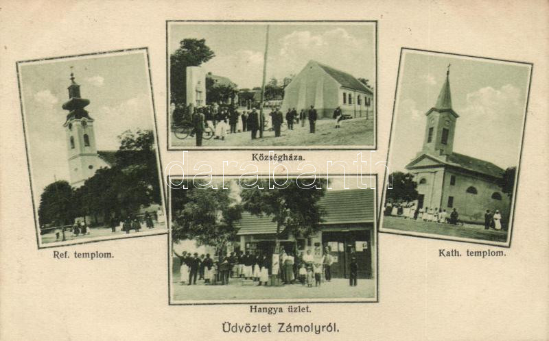Beschreibung: Zámoly Hangya, Református, Katolikus templom, Községháza, Református templom