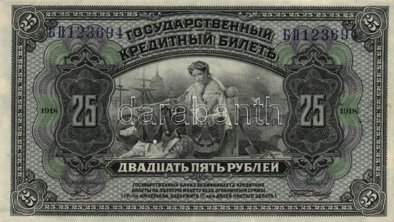 Russia 1918. 25 Rubles with sign... https://www.darabanth.com/de/158-Fernauktion/158.0/Numismatik/Auslandische-Banknoten~600107/Oroszorszag-1918-25R-alairassal-TII-3Cbr3ERussia-1918-25-Rubles-with-signature-CXF~II503629