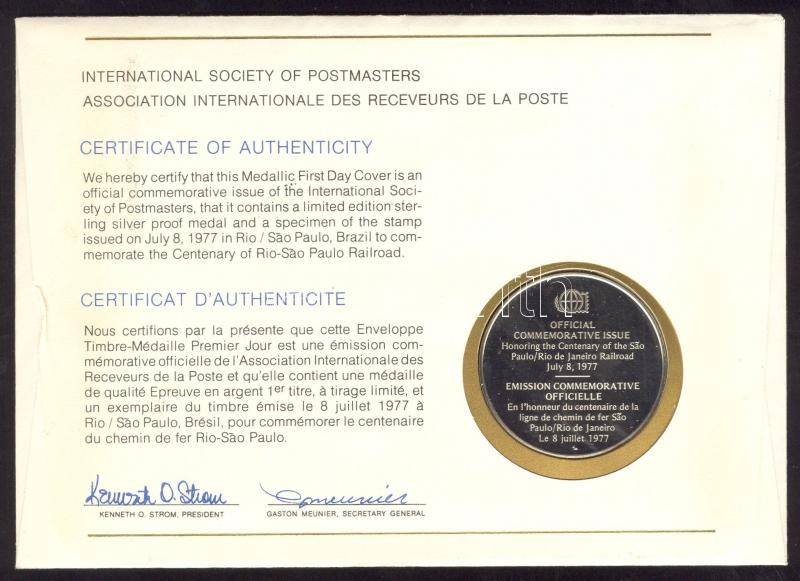 Brasil 1977. "Centenary of Rio-Sao Paulo Railroad" Ag(925) medallion (20g) / International Society of Postmasters - Medallic First Day Cover with Dutch information C:PP