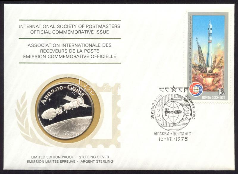 Szovjetunió 1975. "Apollo-Szojuz" a Postamesterek gondozásában kiadott Ag(925) emlékérem 20g érmés, bélyeges borítékon, szovjet bélyeggel, elsőnapi bélyegzővel, holland nyelvű ismertetővel T:PP