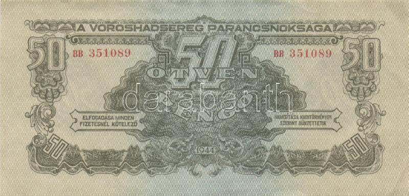 1944. "A Vörörshadsereg Parancsnoksága" 50P T:II+ https://www.darabanth.com/de/158-Fernauktion/158.0/Numismatik/Ungarische-Banknoten~600103/1944-A-Vororshadsereg-Parancsnoksaga-50P-TIIplus~II503732