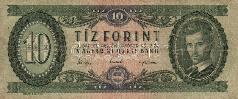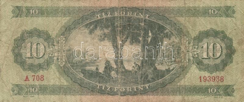 1962. 10Ft fordított hátlapi alapnyomattal "01" T:IV https://www.darabanth.com/de/158-Fernauktion/158.0/Numismatik/Ungarische-Banknoten~600103/1962-10Ft-forditott-hatlapi-alapnyomattal-01-TIV~II503263