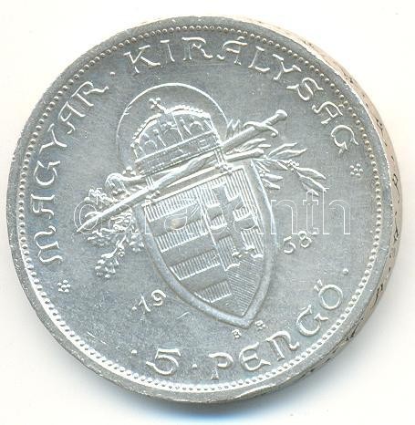 1938. 5P Ag "Szent István" T:2- https://www.darabanth.com/de/158-Fernauktion/158.0/Numismatik/Ungarische-Munzen~600104/1938-5P-Ag-Szent-Istvan-T2-~II503879