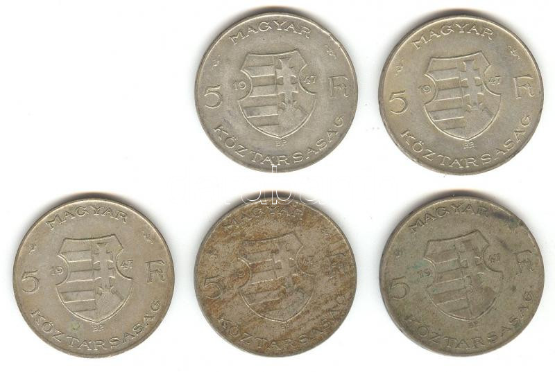 1947. 5Ft Ag "Kossuth" (5x) T:2-,3 https://www.darabanth.com/de/158-Fernauktion/158.0/Numismatik/Ungarische-Munzen~600104/1947-5Ft-Ag-Kossuth-5x-T2-3~II499395