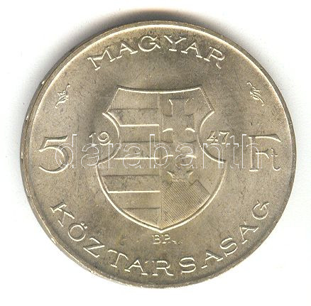 1947. 5Ft Ag "Kossuth" T:2 ph. https://www.darabanth.com/de/158-Fernauktion/158.0/Numismatik/Ungarische-Munzen~600104/1947-5Ft-Ag-Kossuth-T2-ph~II499325