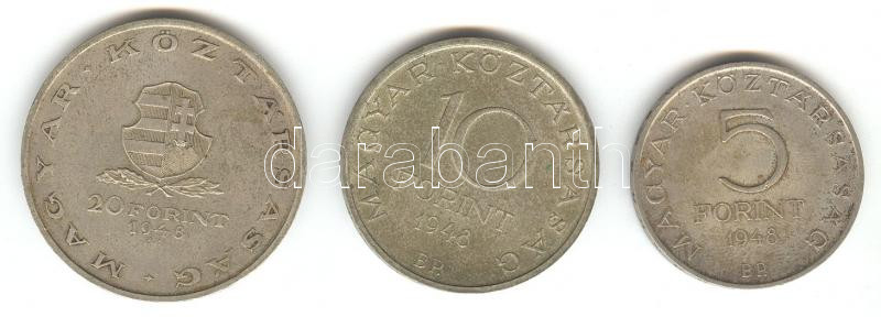 Beschreibung: 1948. 5Ft "Petőfi" + 10Ft "Széchenyi" + 20Ft "Táncsics" Ag sor T:2 ph.