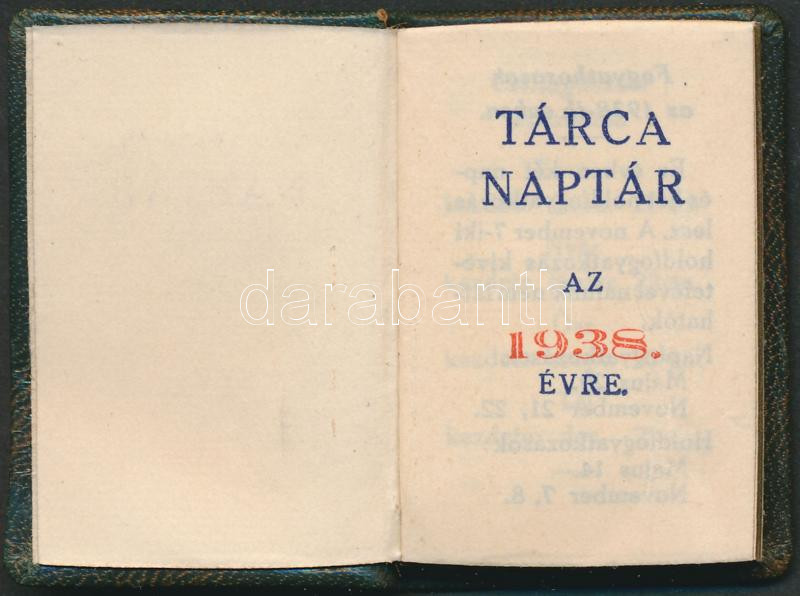 1938 Tárcanaptár igényes bőrkötésben kéményseprővel díszítve, aranyozo... https://www.darabanth.com/de/159-Fernauktion/159.0/Andere-Sammelgebiete/Drucksachen~1200021/1938-Tarcanaptar-igenyes-borkotesben-kemenyseprovel-diszitve-aranyozott-lapszelekkel~II509081