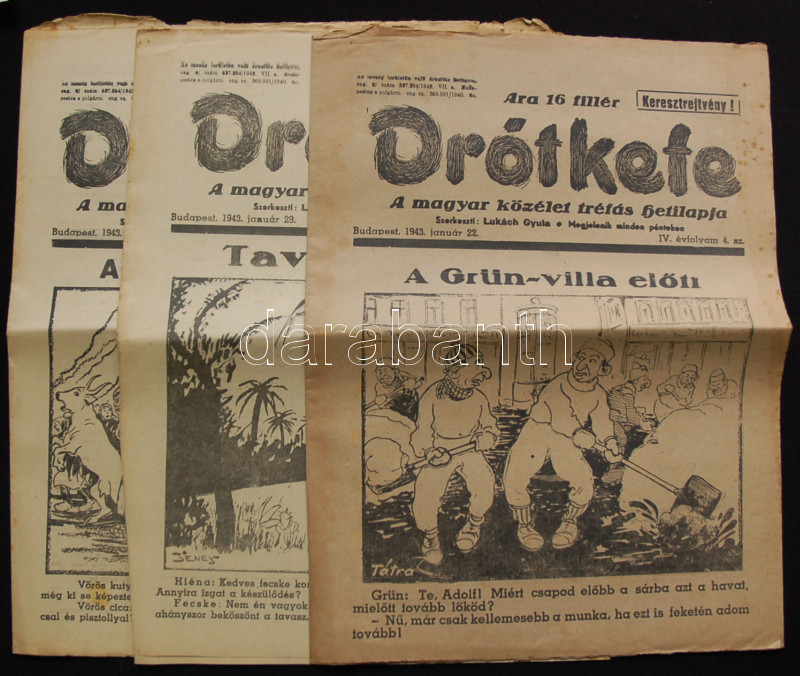 1943. A Drótkefe c. élclap 3 száma jó állapotban https://www.darabanth.com/de/159-Fernauktion/159.0/Andere-Sammelgebiete/Drucksachen~1200021/1943-A-Drotkefe-c-elclap-3-szama-jo-allapotban~II509470