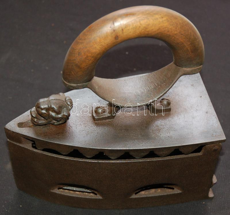 Beschreibung: Újvidéki szenes vasaló oroszlánfejes nyitógombbal, tartóval, szép állapotban /