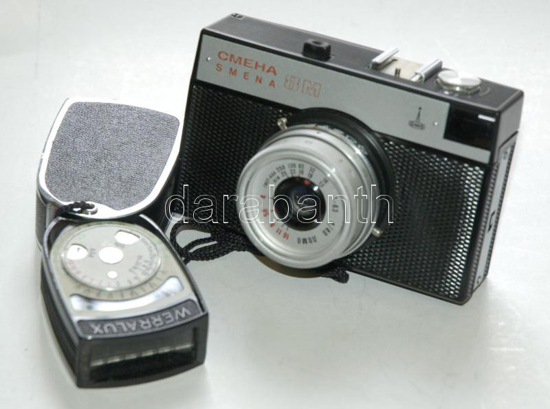 cca. 1970 LOMO Smena 8M szovjet gyártmányú fényképezőgép fénymérővel eredeti bőr tokokban