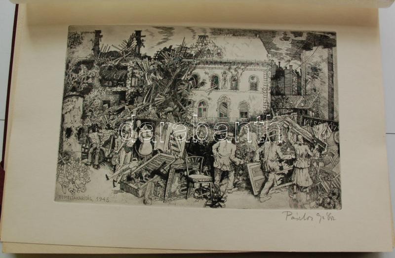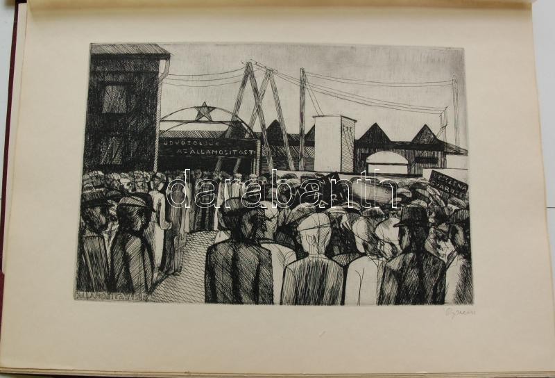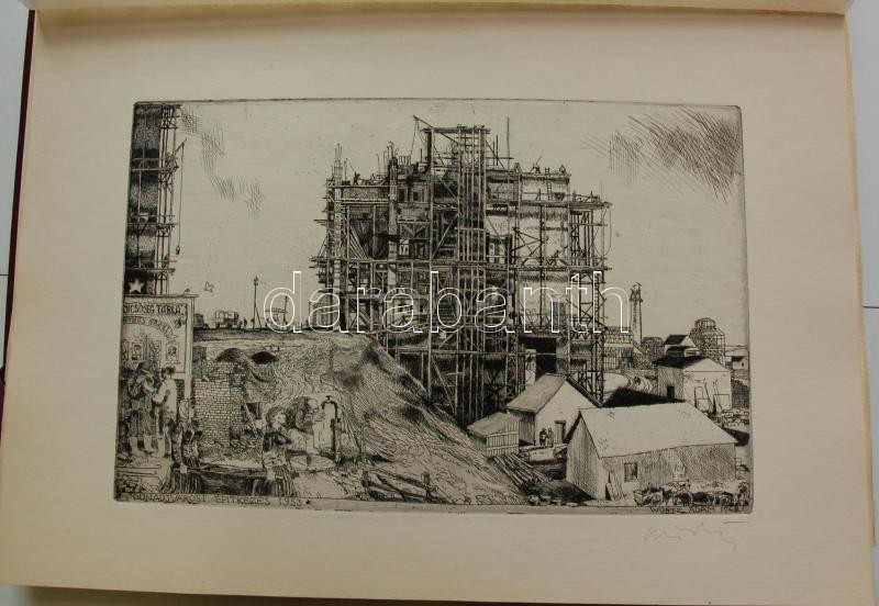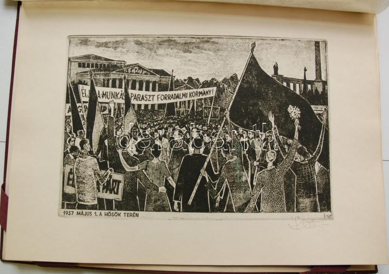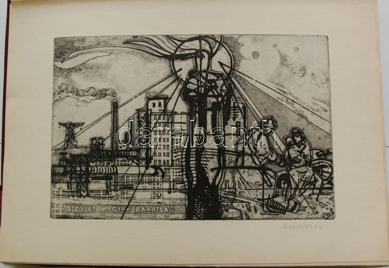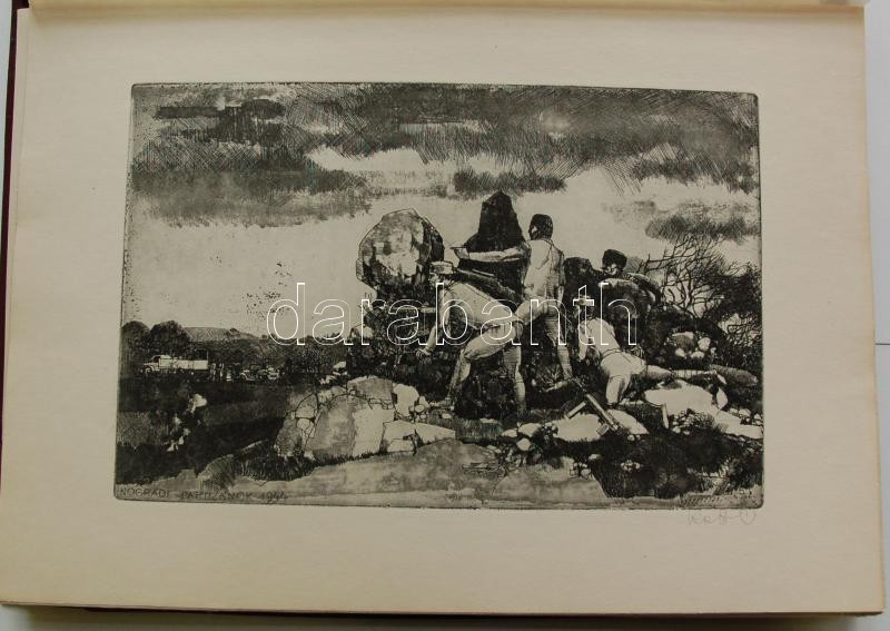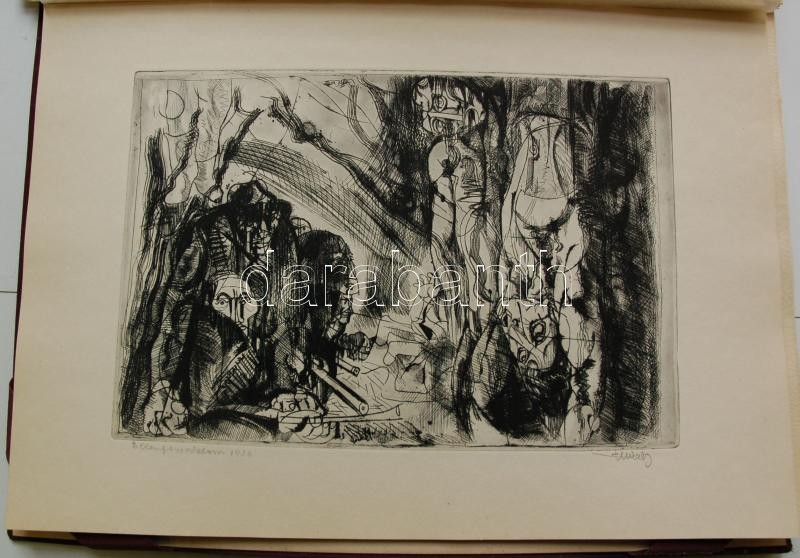 Bp. 1970. k.n. Varga Nándor, Pásztor Gábor, Gars Gábor, Lukovszky László, Czinke Ferenc, Bárczy Pál, Gy. Molnár István, Würtz Ádám, Hincz Gyula, Stettner Béla, Rozarits Tibor, Rékássy Csaba, Raszler Károly, Kerti Károly, Végvári János, Bánffy József, Krajcsirovits Henrik rézkarca, mintás hártyapapírral, szép állapotban. Méret: 280 x 400 mm. A 17 mű mindegyike sajátkezűleg aláírt. 2 sztl. lev. (Tartalomjegyzék, Bevezető szöveg) Kék, jó állapotú kiadói mappában, aranyozott felirattal. Korlátozott példányban jelent meg. Ritka.