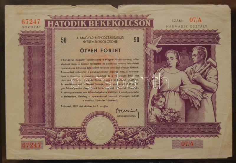 1955. "Hatodik Békekölcsön" nyereménykölcsöne 50Ft-ról szárazpecséttel... https://www.darabanth.com/de/159-Fernauktion/159.0/Numismatik/Aktien-Wertpapieren-und-Tickets~1200144/1955-Hatodik-Bekekolcson-nyeremenykolcsone-50Ft-rol-szarazpecsettel-kis-papirszakadas~II504266