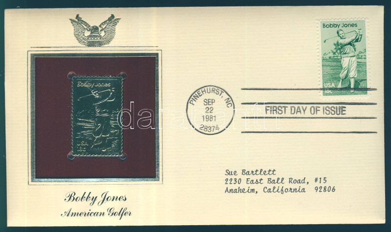 USA/North Carolina 1981. "Bobby Jones 18c/Amerikan golfer" gold(22kt)foil stamp replica on First Day Issue envelop with stamp and information C:Unc
