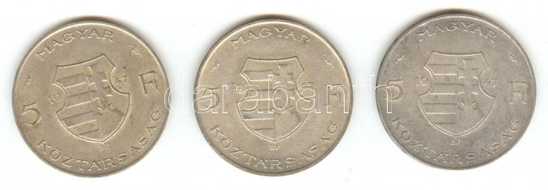 1947. 5Ft Ag "Kossuth" (3x) T:2,3 https://www.darabanth.com/de/159-Fernauktion/159.0/Numismatik/Ungarische-Munzen~1200147/1947-5Ft-Ag-Kossuth-3x-T2-3~II506908