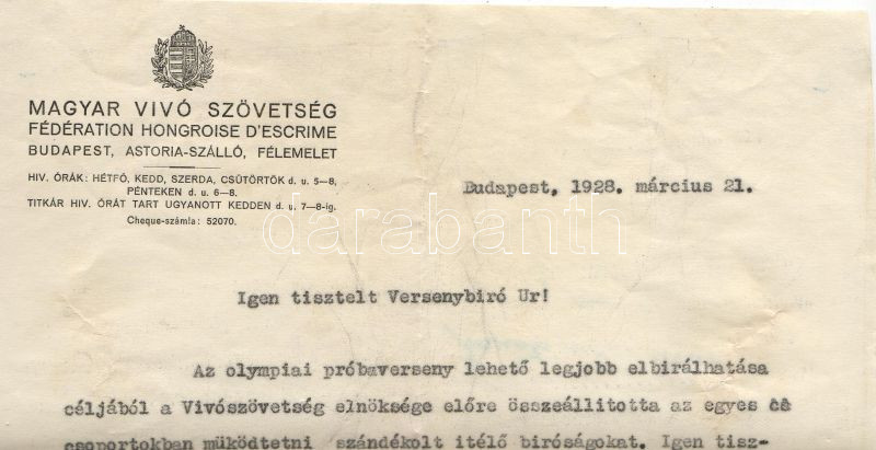 Magyarország 1928 Magyar vívószövetség értesítése versenybírónak https://www.darabanth.com/de/16-Fernauktion/16.0/Andere-Sammelgebiete/~117/Magyarorszag-1928-Magyar-vivoszovetseg-ertesitese-versenybironak~II27081