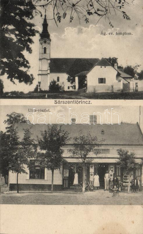 Beschreibung: Sárszentlőrinc, Evangélikus templom, Poór Károly kereskedése (EK)