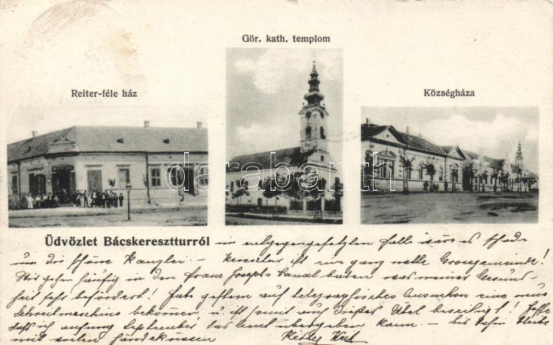 Bácskeresztúr, Reiter's shop, Greek catholic church https://www.darabanth.com/de/16-Gross-Auktion/16.1/Ansichtskarten-Ungarn/Vojvodina~4888/Bacskeresztur-Reiters-shop-Greek-catholic-church~II689401