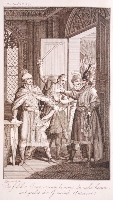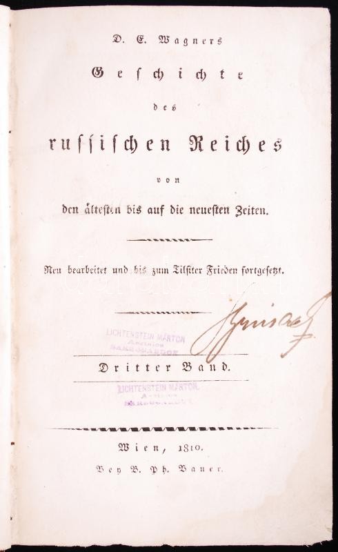 D(aniel) E(rnst) Wagner: Geschichte des russischen Reiches von den ältesten bis auf die neuesten Zeiten. Neu bearbeitet und bis zum Tilsiter Frieden fortgesetzt. Bde. III-VI. Wien, 1810, Ph. Bauer. Korabeli félvászon kötésben, színezett lapszélekkel, két címképmetszettel, a kötésen kisebb kopások, egyébként jó állapotú /