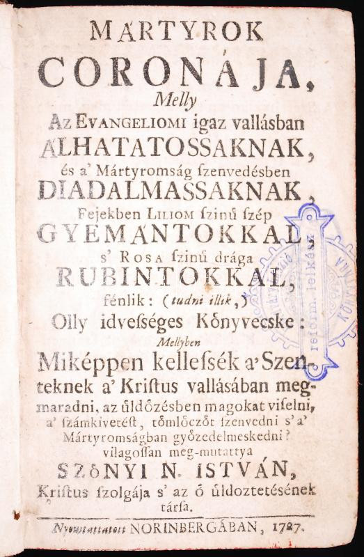 Szőnyi N[agy] István: Mártyrok coronája, melly az Evangeliomi igaz vallásban álhatatossaknak, és a Mártyromság szenvedésben diadalmassaknak, fejekben Liliom szinü szép gyémántokkal, s' Rosa szinü drága rubintokkal, fénlik: (tudni illik,) olly idvességes könyvecske: mellyben miképpen kellessék a' Szenteknek a Kristus vallásában meg-maradni, az üldözésben magokat viselni, a számkivetést, tömlöczöt szenvedni s a Mártyromságban gyõzedelmeskedni? világossan meg-mutattya--. Norinbergában (Nürnberg), 1727, k.n. Korabeli egészbőr kötésben (a kötés kissé viseltes, az előzéklapon és címlapon a korábbi tulajdonosok bejegyzése és pecsétje látható)