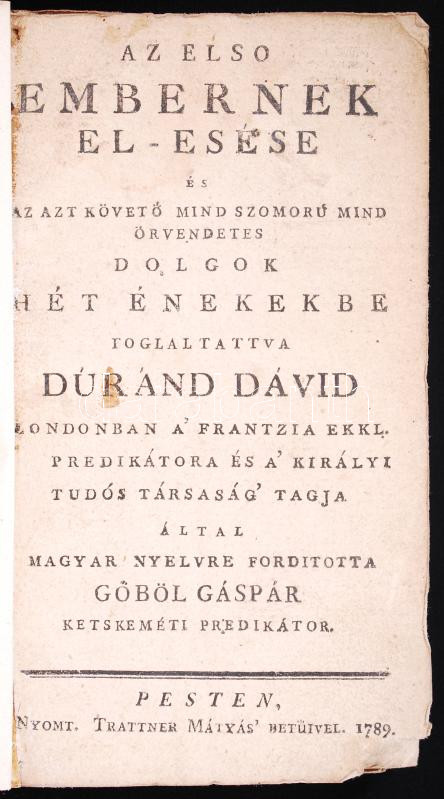 Beschreibung: Durand, David: Az elsÅ‘ embernek el-esése és az azt követÅ‘ mind szomorú, mind örvendetes dolgok hét énekbe foglaltattva Magyar nyelvre fordÃtotta Göböl Gáspár. Pest, 1789. Trattner Mátyás. 212 p.