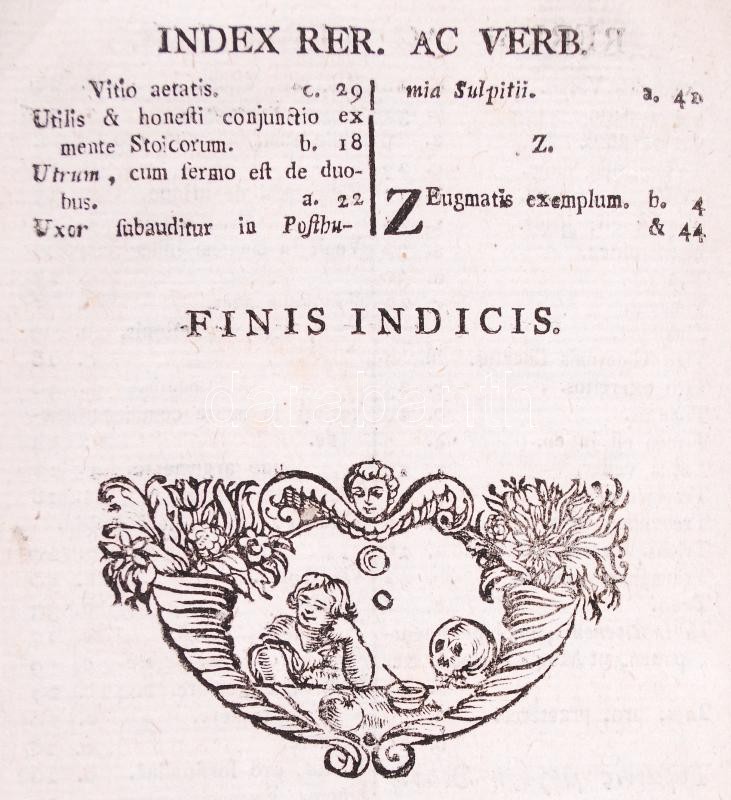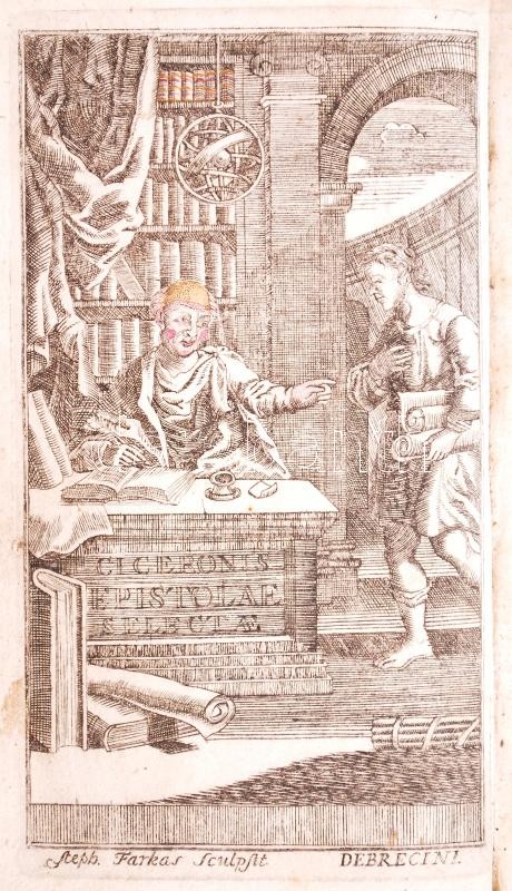 M. T. Ciceronis: Epistolarum selectarum libri tres. Quos Notis illustravit Joannes Gasparus Schröderus. Addita est vita Ciceronis a Dionysio Lambino collecta. Debrecini, 1767, excudit Stephanus Margitai Typogr. Korabeli, bordázott, már megkopott aranyozású egészbőr kötésben, Farkas István debreceni rézmetsző diák címképével, kétszínnyomású címlappal, rajta fametszetű vignettával, valamint könyv- és záródíszekkel. A gerincen és a sarkakon sérülések