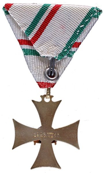 Hungary 1928. "Military Long Service Cross for Officers 3rd Class" gold-plated Br cross on white ribbon with red-white-green stripes C:AU
