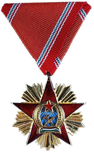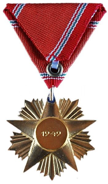 Hungary 1949. "Order of Merit of the Hungarian Peoples Republic V class" gilt Br enamelled decoration on ribbon with miniature C:UNC Only 1619 pieces of this version.