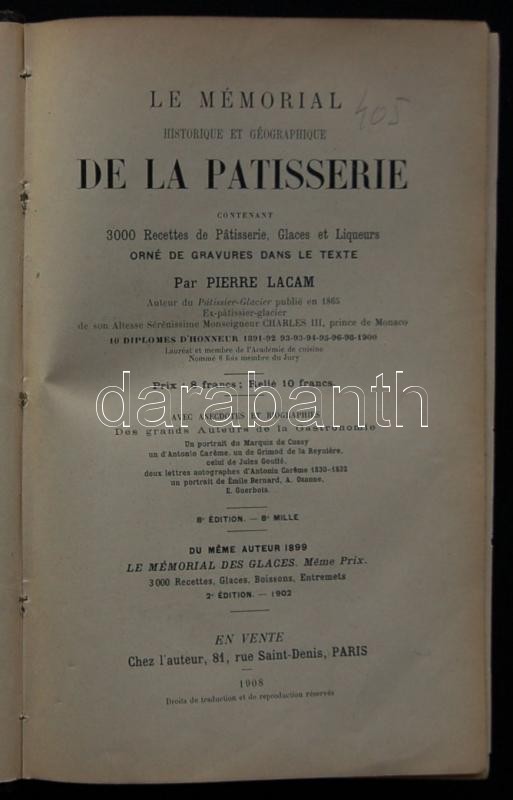 Pierre Lacam: Le mémorial historique et géographique de la patisserie contenant 3000 recettes de patisserie, claces et liqueurs. Orné de gravures, 8e éd. Paris, 1908 /