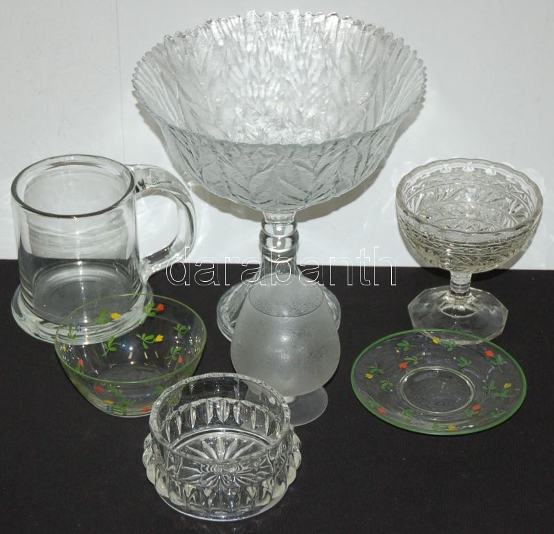 Beschreibung: Nagy üveg tétel: nagy, talpas gyümölcsös tál, fagylaltos kehely, pohár, festett tányér tálkával stb.