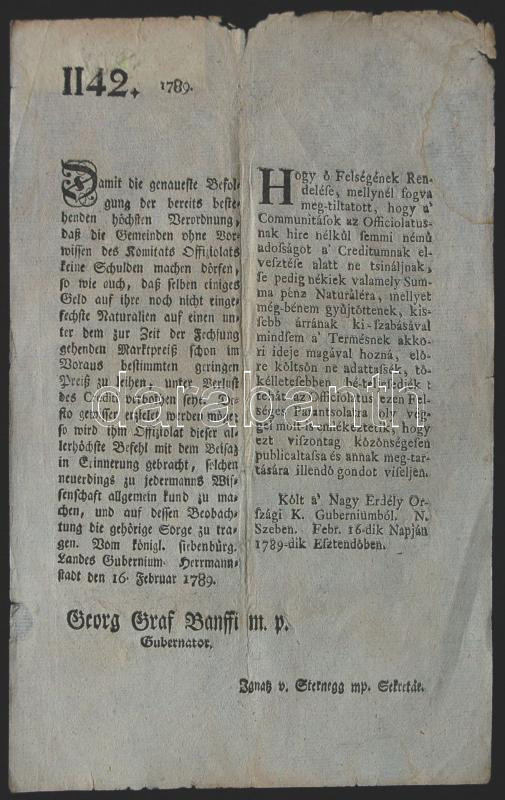 1789 Bánffi György erdélyi kormányzó kétnyelvű pénzügyi rendelete https://www.darabanth.com/de/160-Fernauktion/160.0/Andere-Sammelgebiete/Historische-Dokumenten-Handschriften~2000005/1789-Banffi-Gyorgy-erdelyi-kormanyzo-ketnyelvu-penzugyi-rendelete~II510762