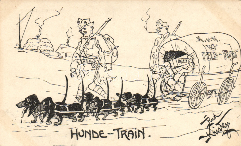 Dog train, military humour s: Rudolf Kristen https://www.darabanth.com/de/160-Fernauktion/160.0/Ansichtskarten/Militar~2000088/Dog-train-military-humour-s-Rudolf-Kristen~II512039