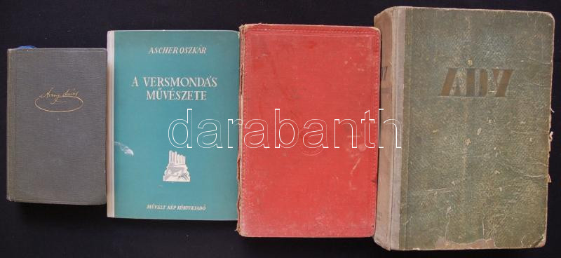 Beschreibung: Szépirodalmi könyvtétel: Arany János összes költeményei, Petőfi Sándor összes költeményei, Ady Endre összes versei, Ascher Oszkár: A versmondás művészete