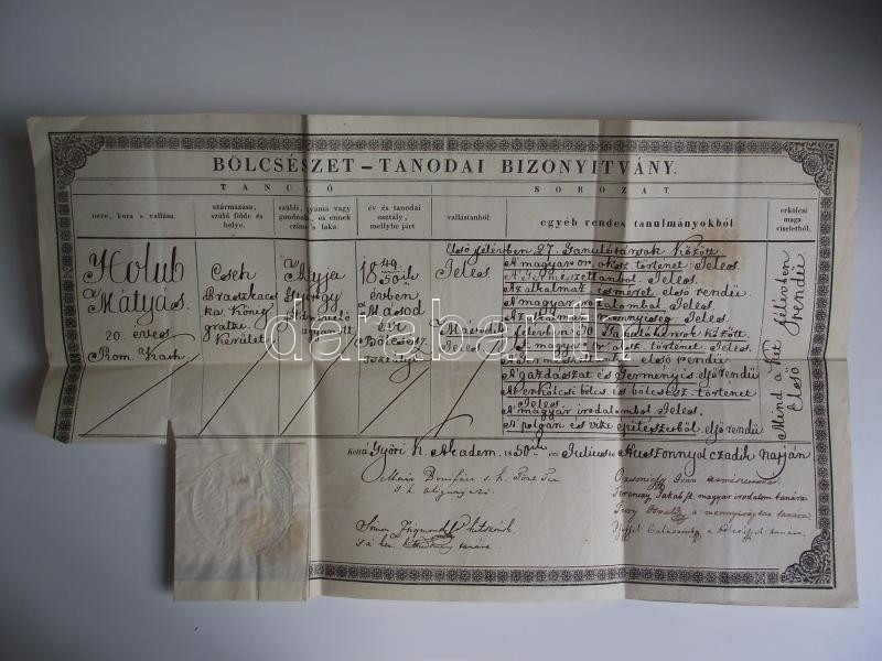 1850 Holub Mátyás Bölcsészet Tanodai Bizonyítványa a Győri Akadémián https://www.darabanth.com/de/161-Fernauktion/161.0/Andere-Sammelgebiete/Dokument~500004/1850-Holub-Matyas-Bolcseszet-Tanodai-Bizonyitvanya-a-Gyori-Akademian~II519734