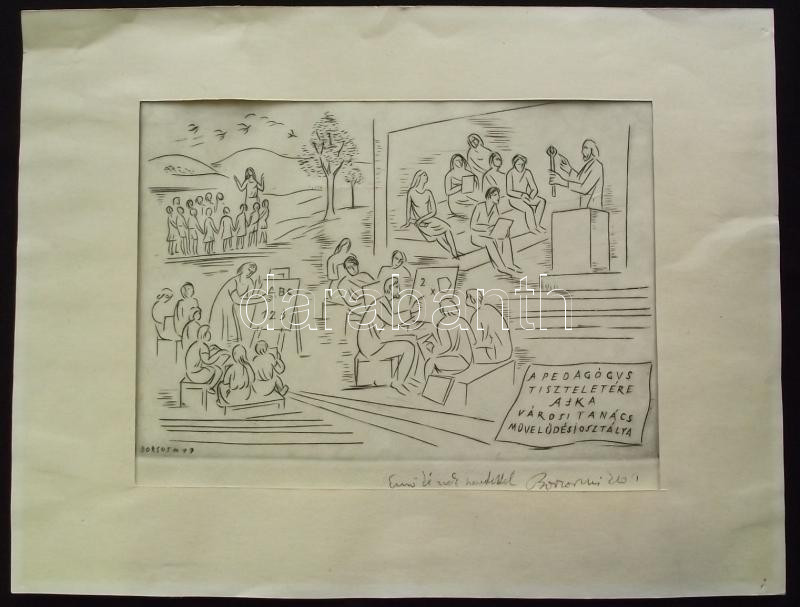 Beschreibung: Borsos Miklós (1906-1990): A pedagógus tiszteletére, rézkarc-papír, dedikált, jelzett, paszpartuzva, 43x32cm
