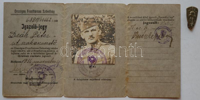 Beschreibung: 1934 Országos Frontharcos Szövetség Igazoló-jegy fényképpel és egy frontharcos jelvény