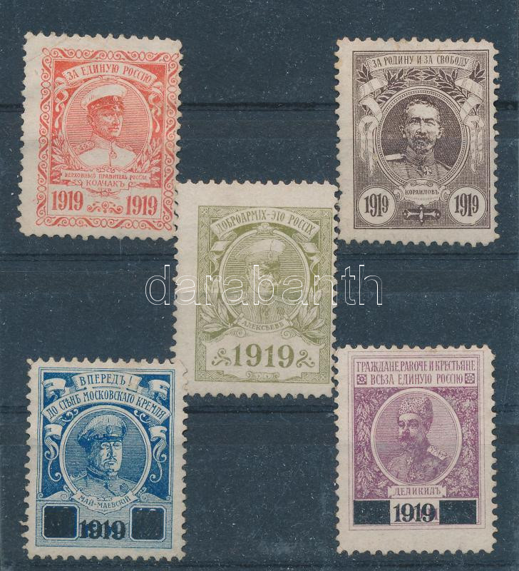 5db orosz bélyeg a fehérek tábornokainak portréival 1919-ből https://www.darabanth.com/de/161-Fernauktion/161.0/Andere-Sammelgebiete/Paraphilatelie~500002/5db-orosz-belyeg-a-feherek-tabornokainak-portreival-1919-bol~II520322