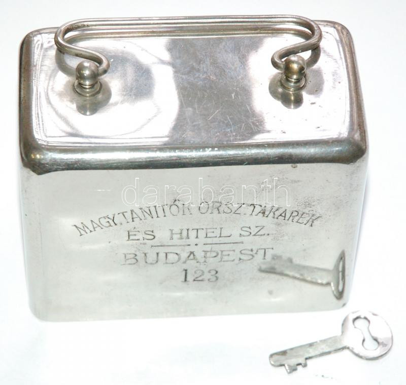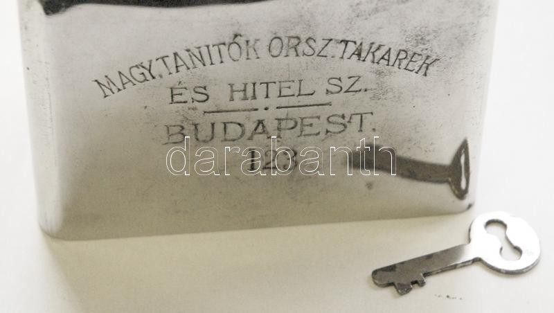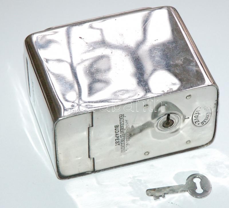 cca 1900 Arnheim S. J. Pénzszekrény és Tresorgyár által jelzett fém pénzpersely eredeti kulcsával, érmének és papírpénznek való nyílással, szép állapotban /